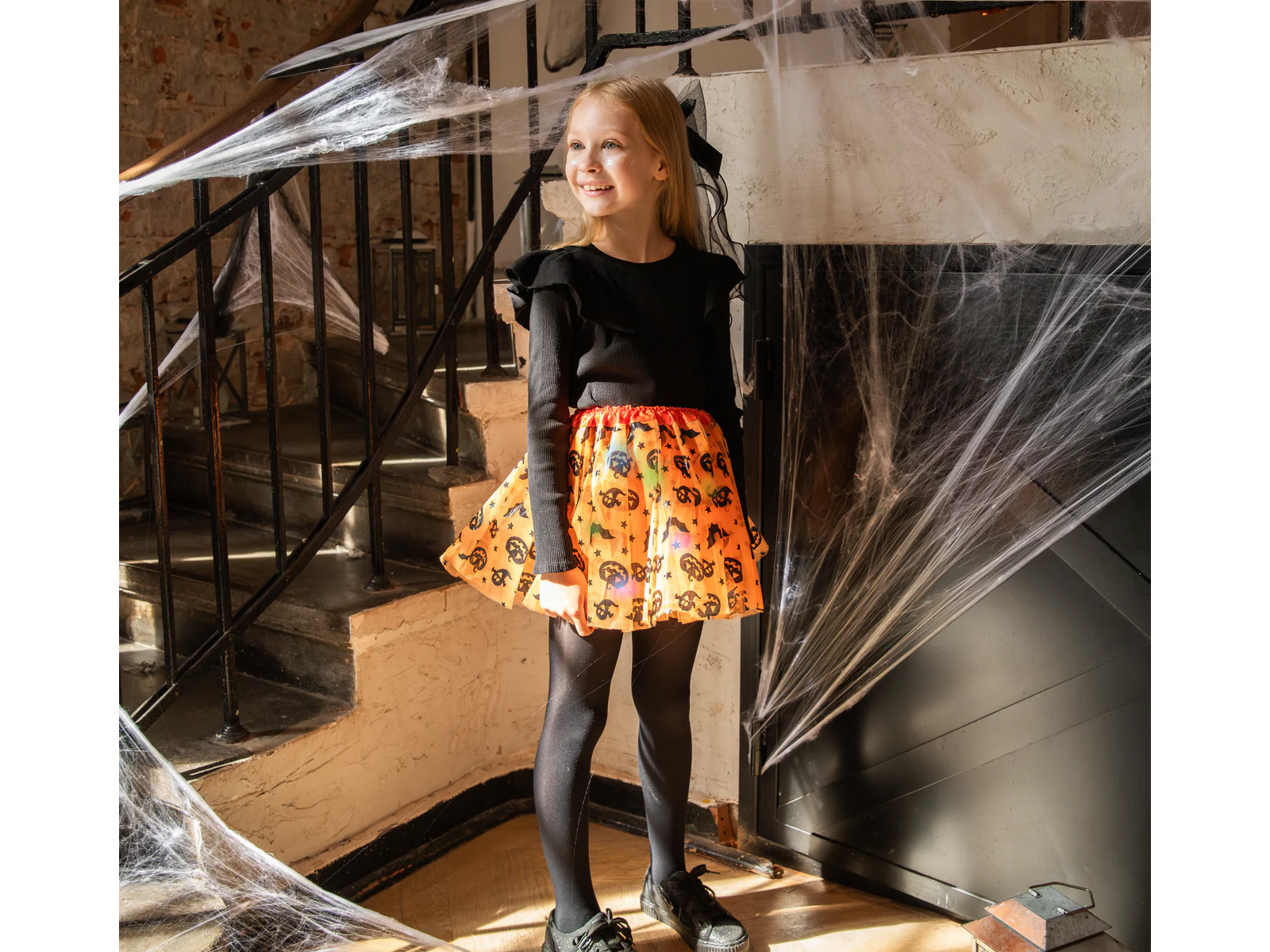 Transformați Halloween-ul într-un eveniment magic cu Fusta tutu dovleac. Această fustă adorabilă din tul într-o culoare portocalie vibrantă are trei straturi de tul pentru un aspect adorabil. Costumul este decorat cu delicate lumini LED, care strălucesc subtil, adăugând o notă de farmec petrecerilor trick-or-treat sau de Halloween.
