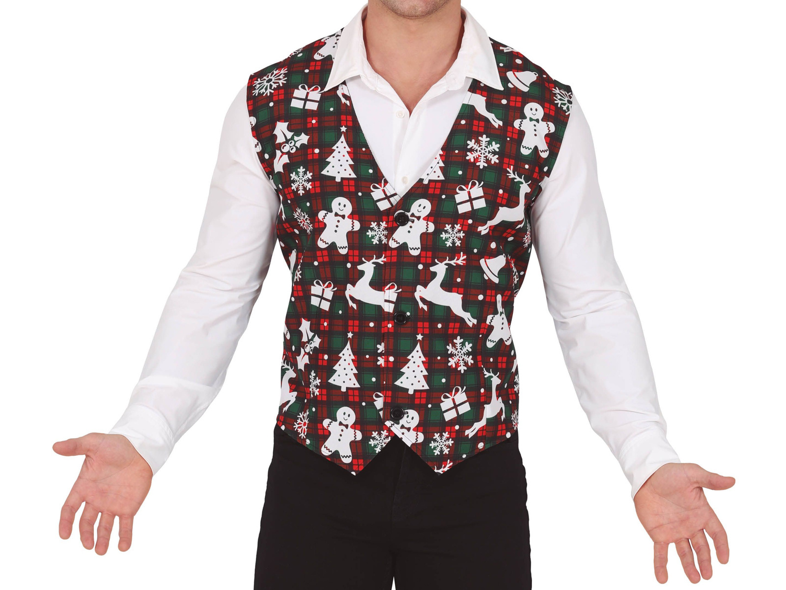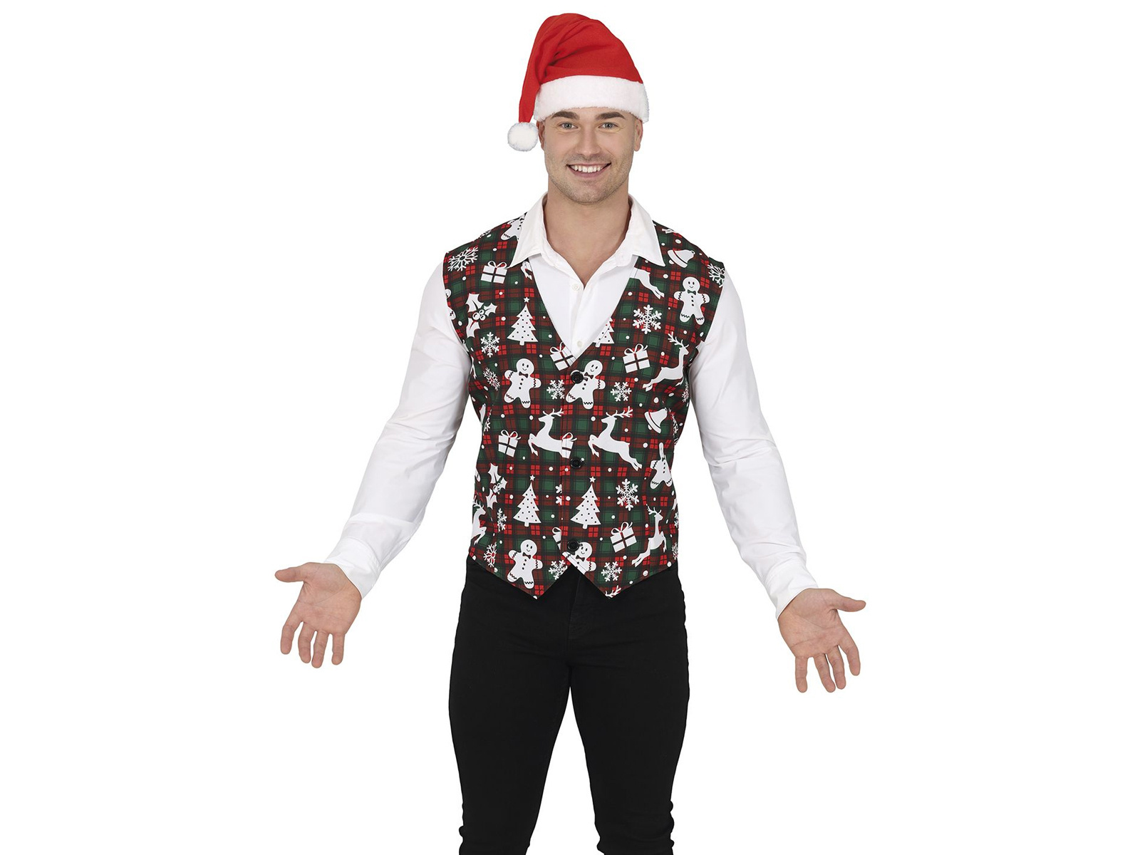 Bucurați-vă de stilul festiv cu vestonul nostru unic de Crăciun. Acest accesoriu elegant vine într-un model clasic roșu și verde în carouri, care este perfect pentru atmosfera festivă. Farmecul suplimentar este adăugat de imprimeul de Crăciun delicat, dar distinctiv, care face din vestă nu numai un articol vestimentar, ci și o o decorațiune festivă.