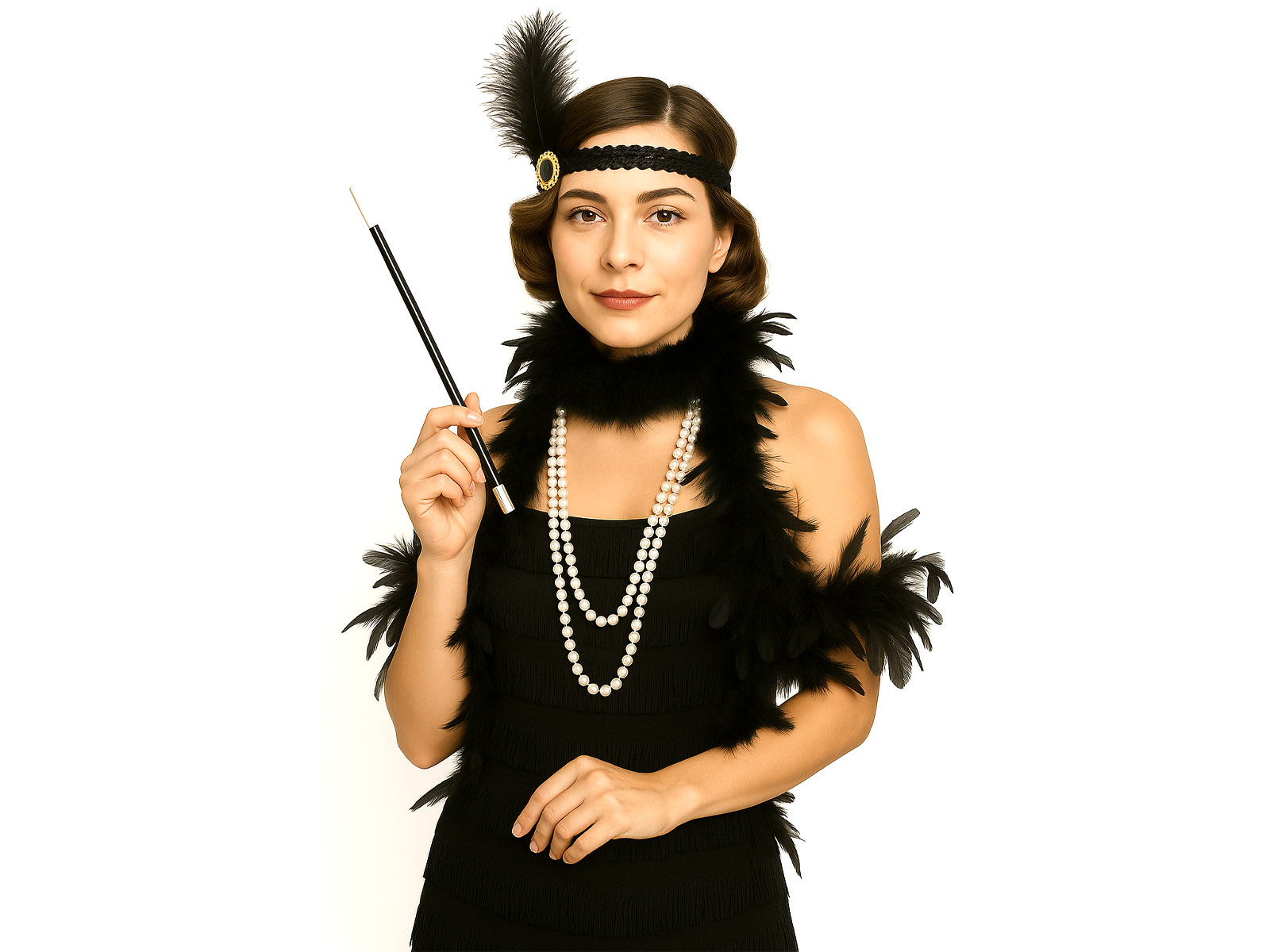 Descoperiți atmosfera plină de farmec a anilor 20s., 30. i 40. datorită Setului Retro Black cu Boa. Fiecare element a fost atent selectat pentru a asigura o prezență excepțională la un eveniment elegant sau petreceri tematice, cum ar fi Revelionul, Carnavalul sau Crăciunul.