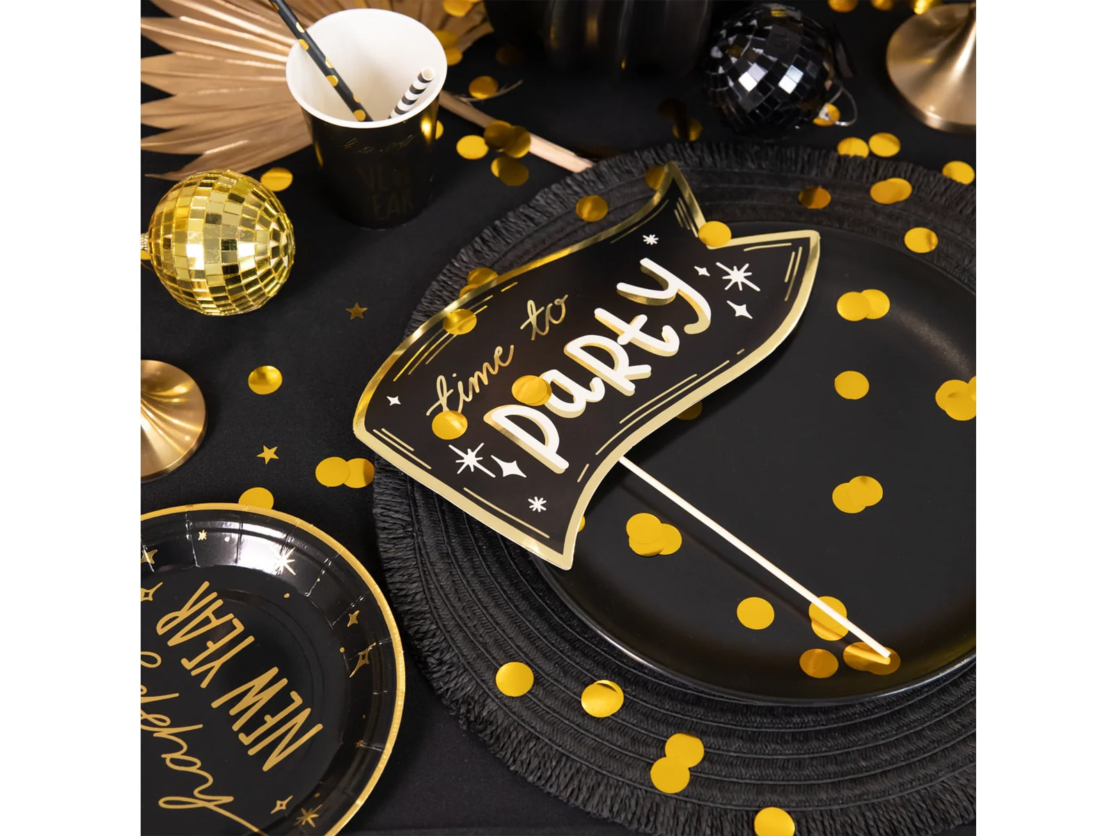 Complet cu: pălărie, ochelari x 2, papion, cravată, mustață x 2, gură, sticlă de șampanie, microfon, ochelari cu stea, ochelari de Anul Nou fericit, semn de Anul Nou fericit, semn de petrecere.