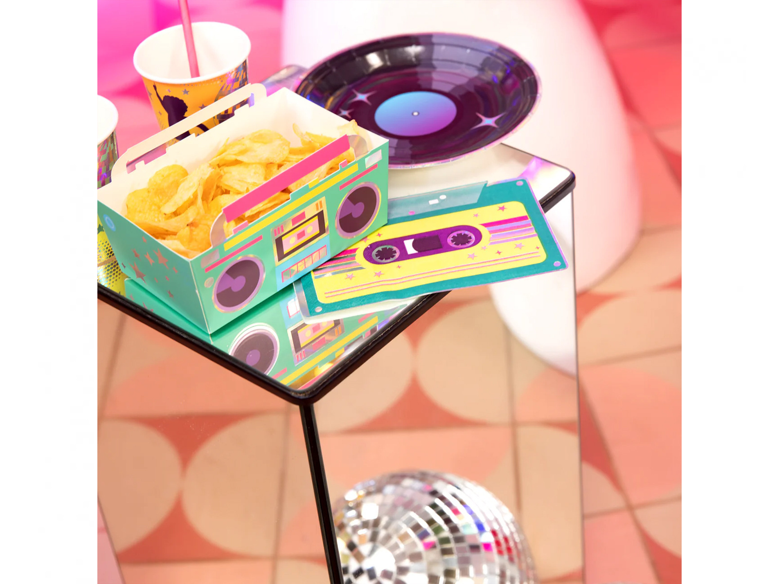 Încântați invitații la petrecerea dvs. cu cutii de chipsuri unice inspirate din epoca Disco! Acest set 6 cutii de hârtie în formă de radiouri elegante din anii 1960. este modul ideal de a servi gustări la carnavaluri, zile de naștere și alte ocazii speciale.