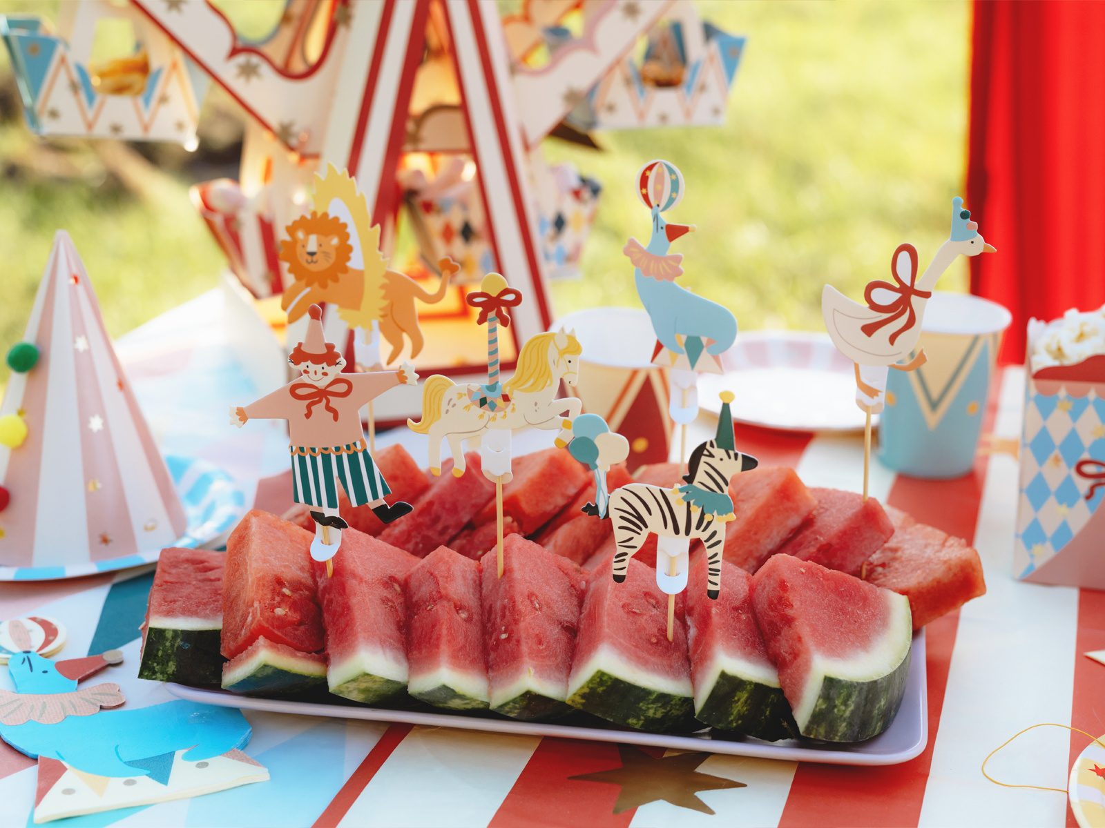 Desene pe quilters: un clovn zâmbitor, o focă cu o minge, o zebră cu o pelerină, un leu care sare printr-un cerc, un cal de carusel și o gâscă cu o panglică.
