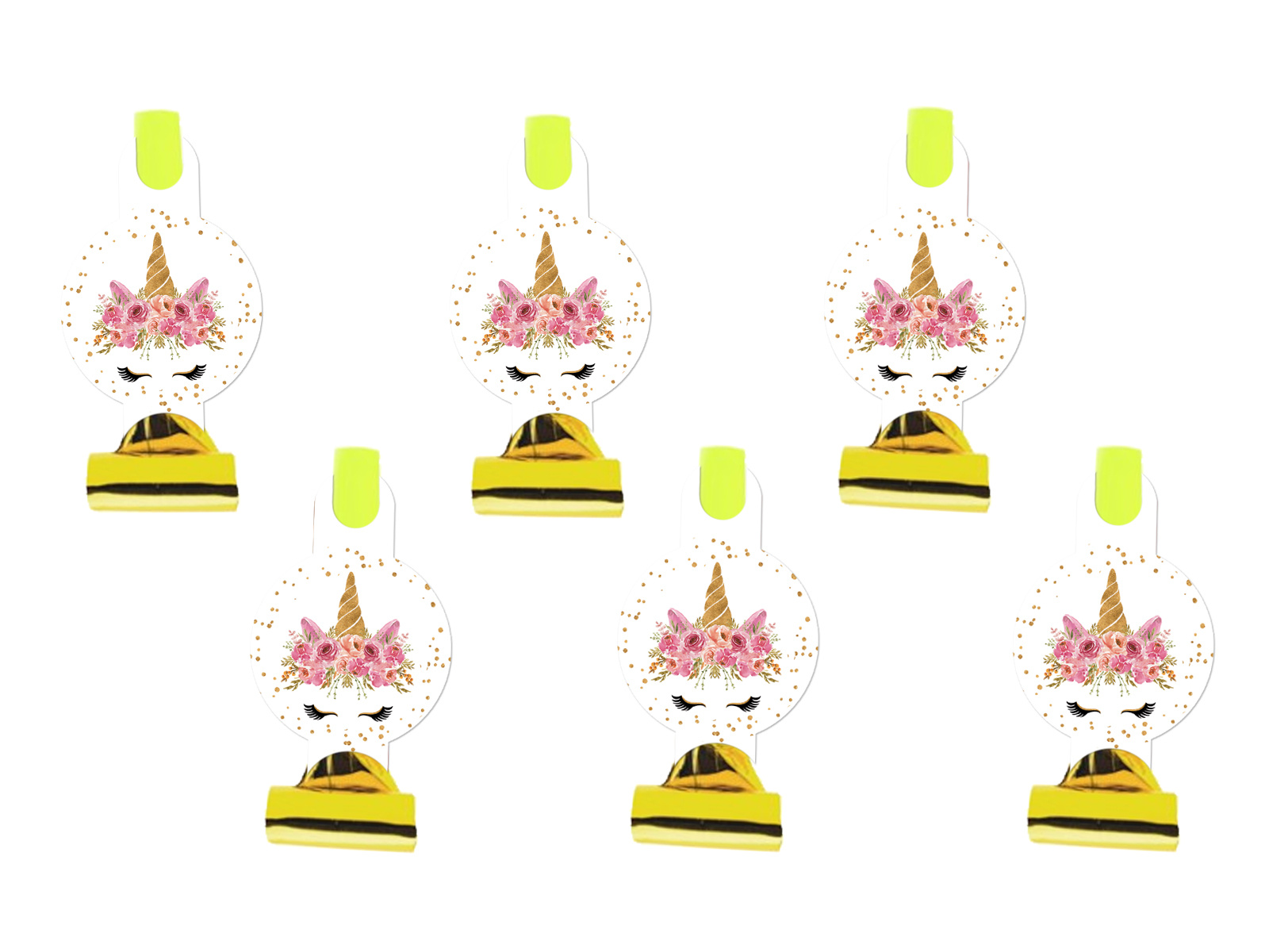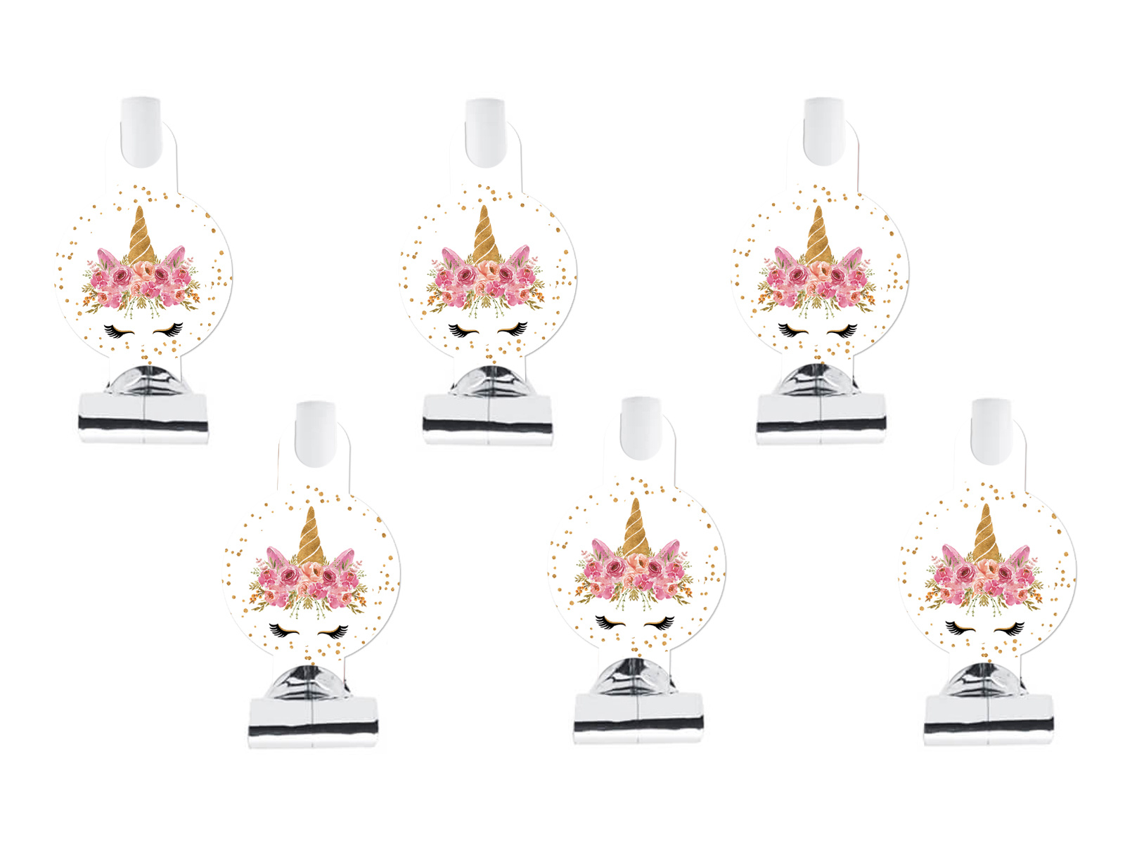 Simțiți magia oricărei petreceri cu fluierul nostru unic de trompetă cu motiv de unicorn! Fiecare fluier este decorat cu o imprimare colorată reprezentând un cap de unicorn înconjurat de o ghirlandă florală, adăugând un farmec unic sărbătorilor.