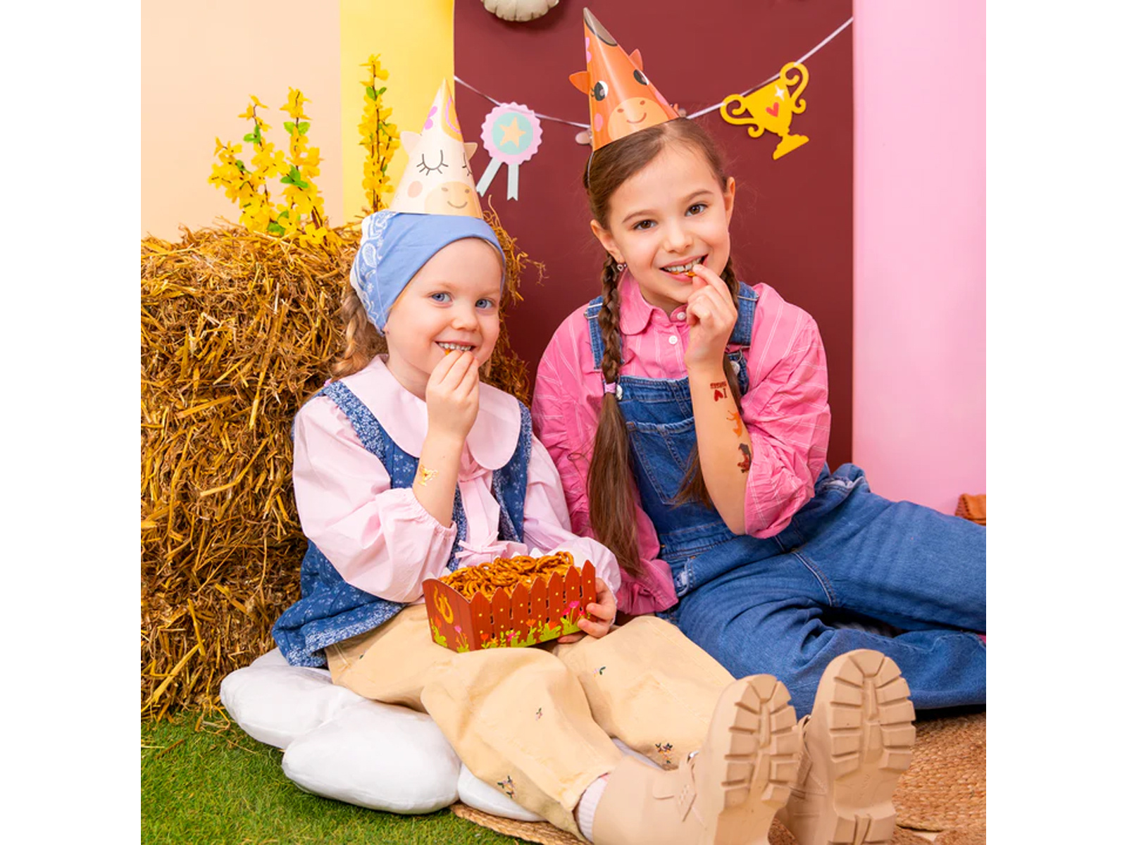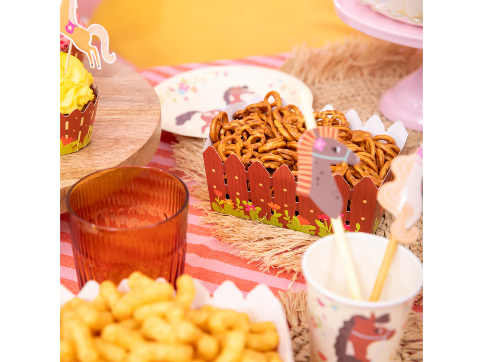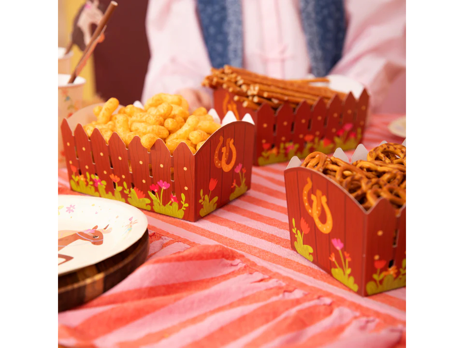 Descoperiți modul perfect de a servi gustări la orice petrecere pentru copii cu cutiile noastre de hârtie "Stable". Concepute cu gândul la micii iubitori de cai, aceste cutii adorabile sunt decorate cu un imprimeu care seamănă cu o ușă de grajd, creând o atmosferă magică la orice petrecere aniversară sau picnic. Fabricat din hârtie, nu sunt doar plăcute din punct de vedere estetic, ci și ecologice.