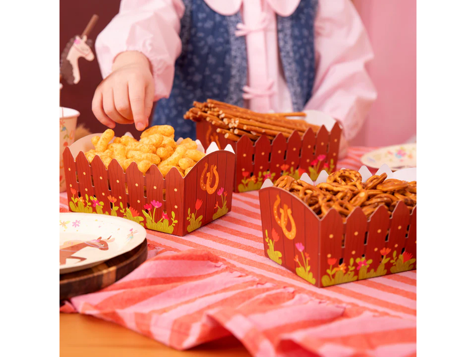 Kitul include trei cutii, astfel încât să puteți planifica cu ușurință amenajarea unui spațiu de petrecere pentru mai mulți copii. În plus, cutiile sunt completarea perfectă a decorațiunilor tematice din seria "Horses", coordonându-se perfect cu alte elemente de styling.