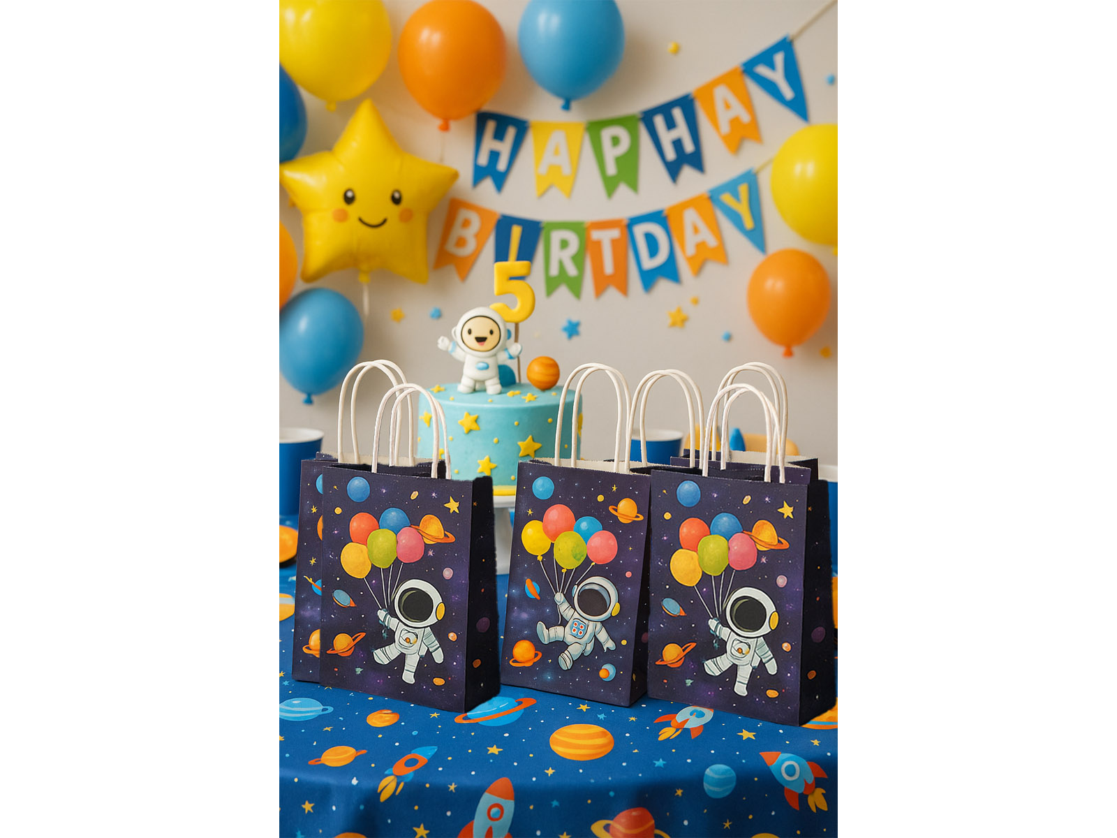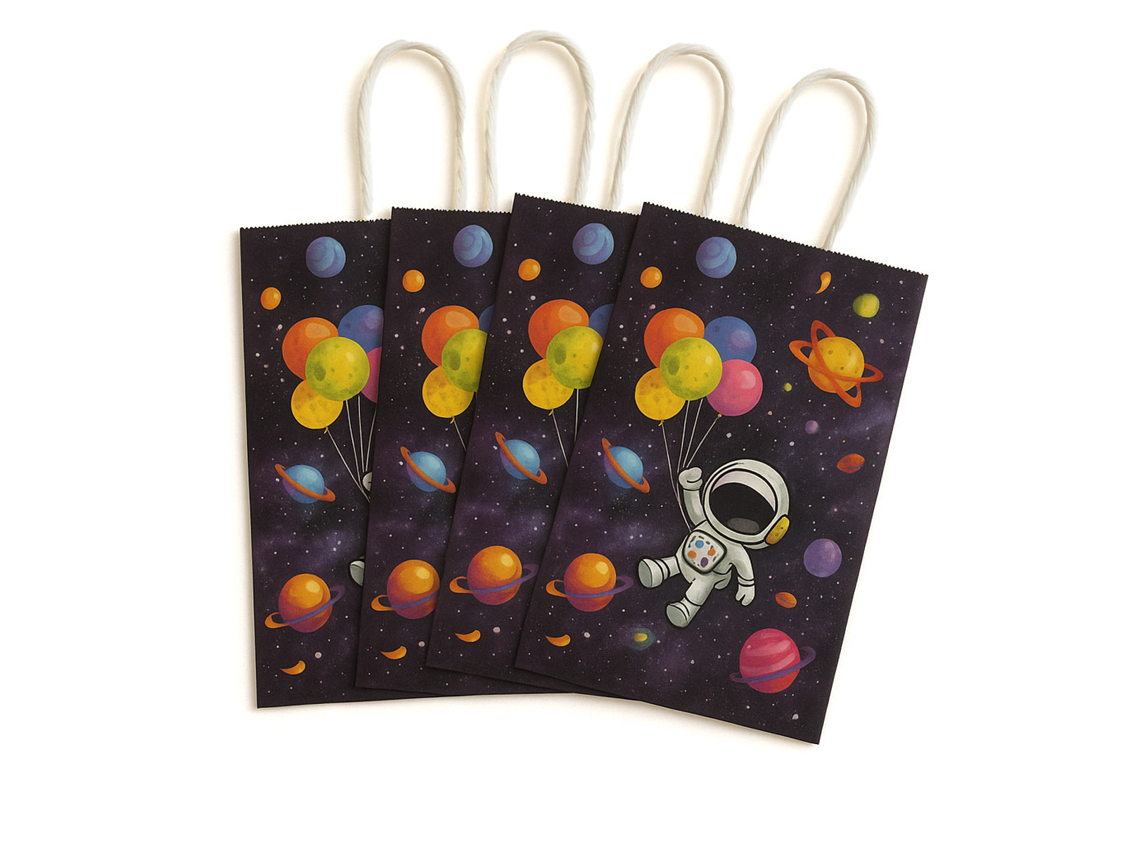 Aceste pungi adorabile sunt perfecte pentru petrecerile aniversare pentru copii cu tematică spațială. Nu numai că funcționează bine ca ambalaj de cadou pentru băiatul sau fata aniversată, dar pot fi folosite și pentru a oferi mici cadouri oaspeților. Modelele cu rachete și planete vor aduce cu siguranță un zâmbet pe fețele micilor astronomi.