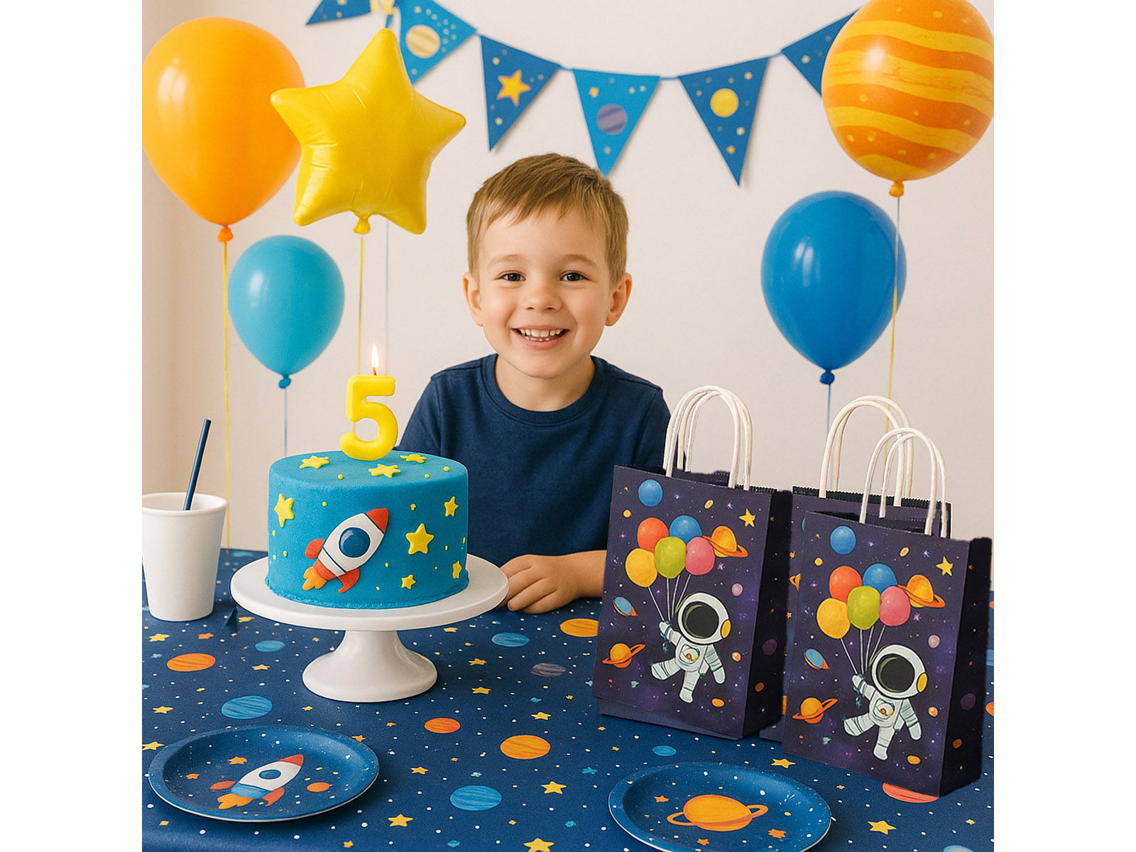 Combină-le cu alte accesorii aniversare din aceeași serie pentru a crea un decor de petrecere coerent și memorabil. Gențile nu sunt doar practice, ci oferă și un element decorativ care îi va introduce pe copii în aventurile de dincolo de Pământ.