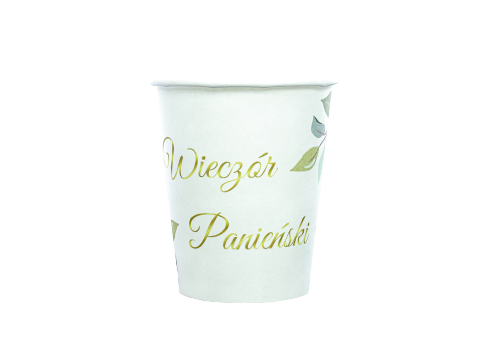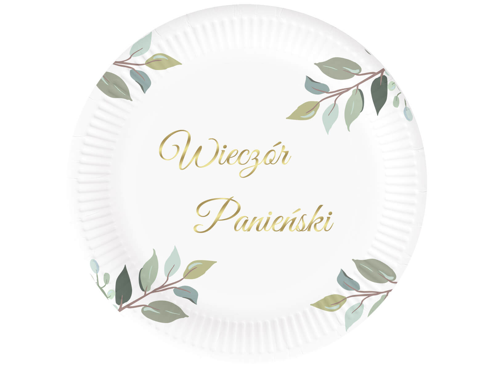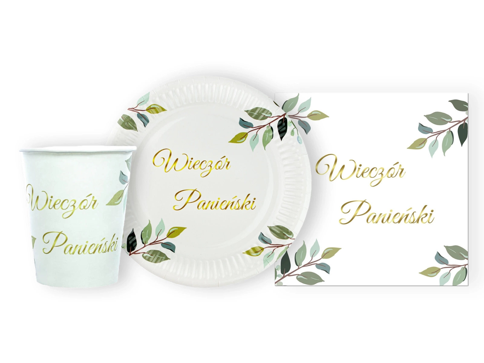 Veselă de unică folosință de culoare albă cu un imprimeu de frunze verzi și litere aurii Ladies' Evening, perfectă pentru o seară a doamnelor în stil rustic.