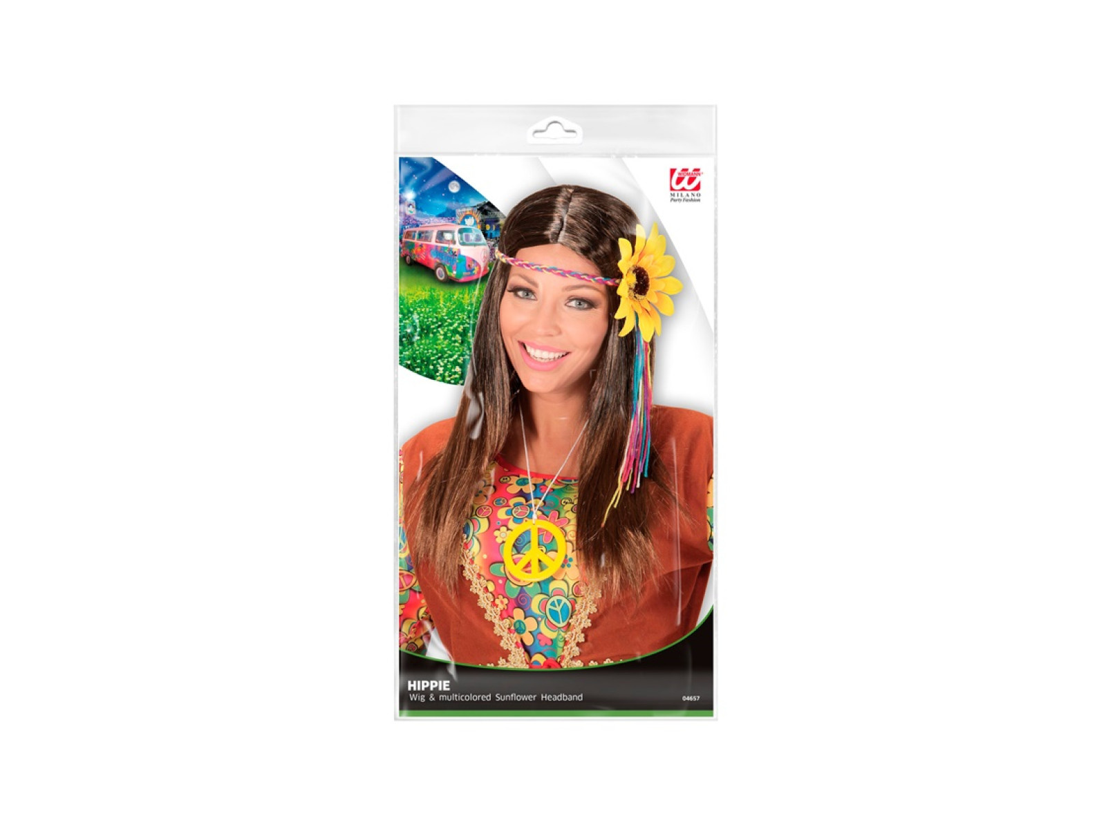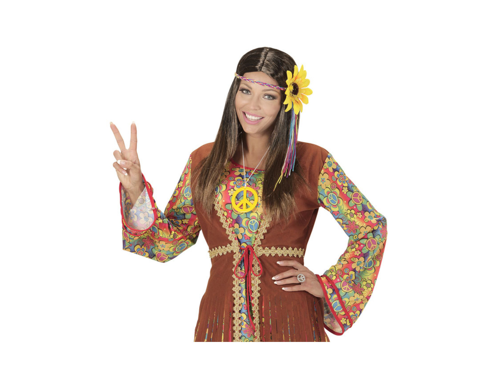 Peruca hippie maro cu bentiță multicoloră cu motive de floarea soarelui