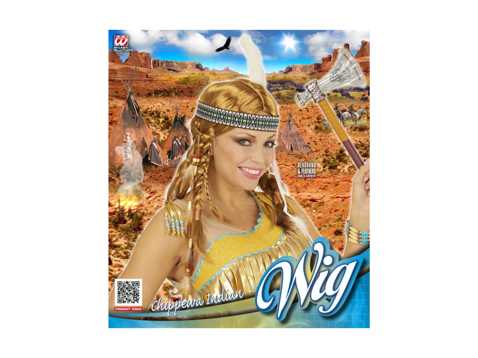 Peruca indiană Chippewa cu împletituri, margele, bentiță și pene