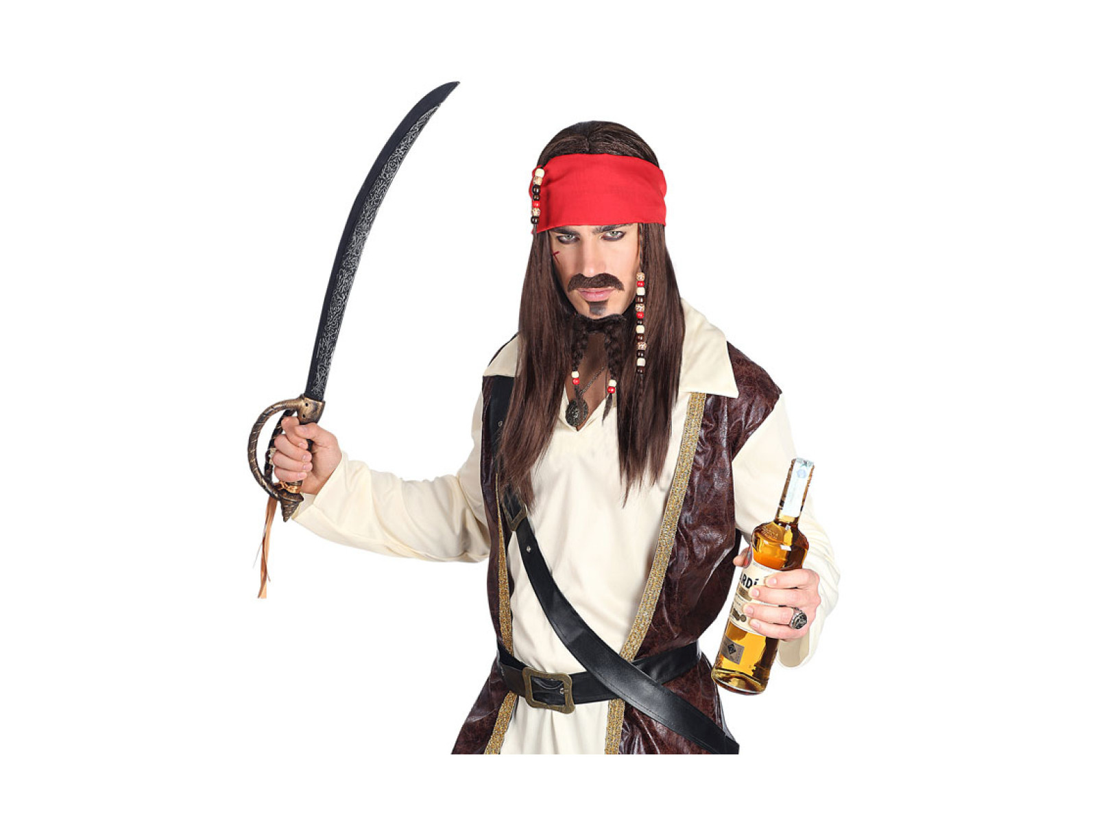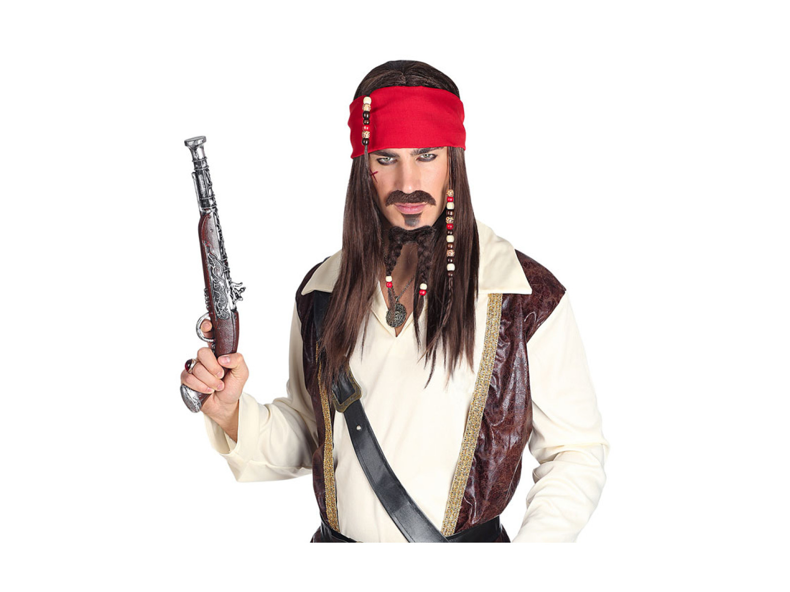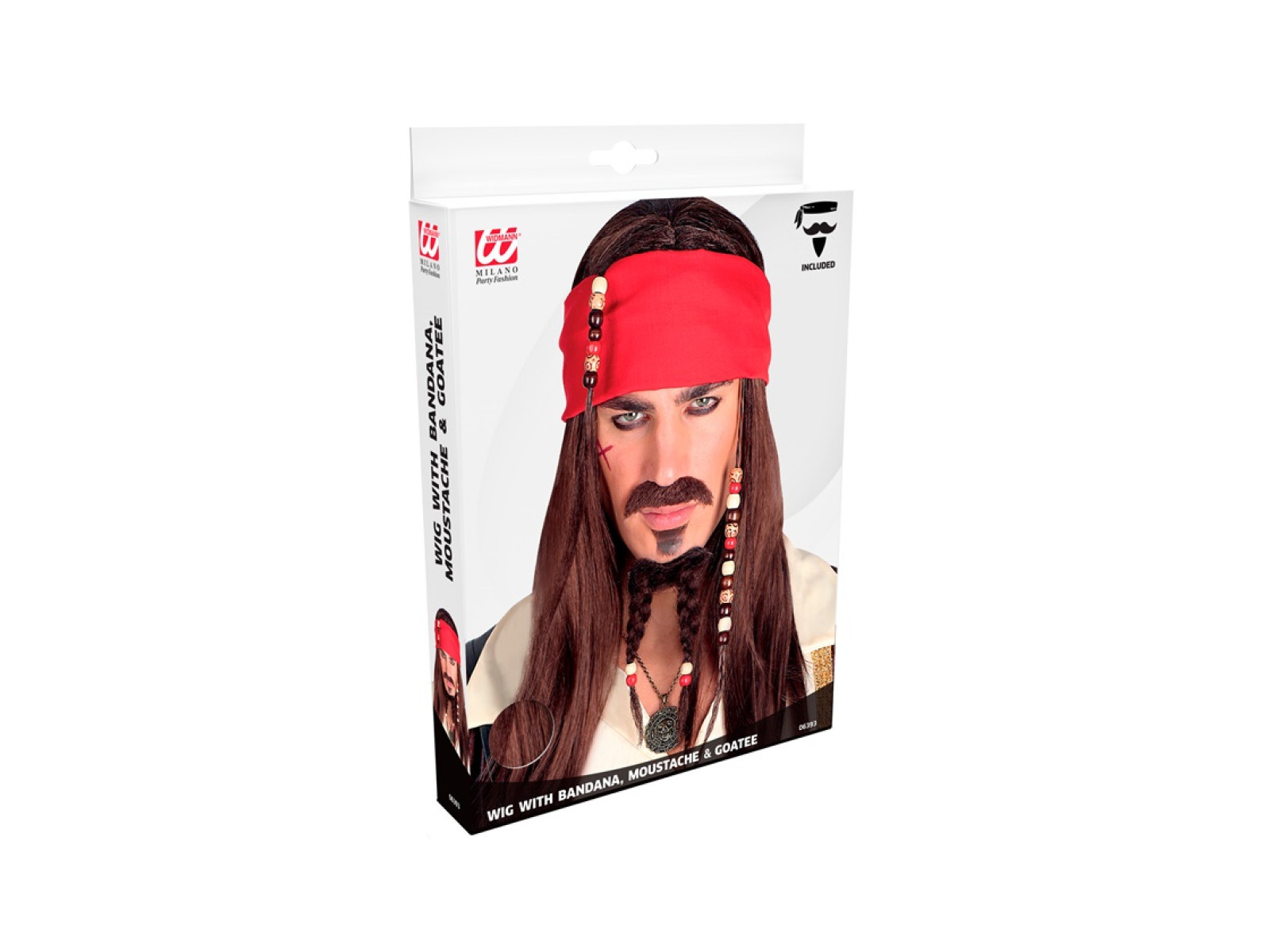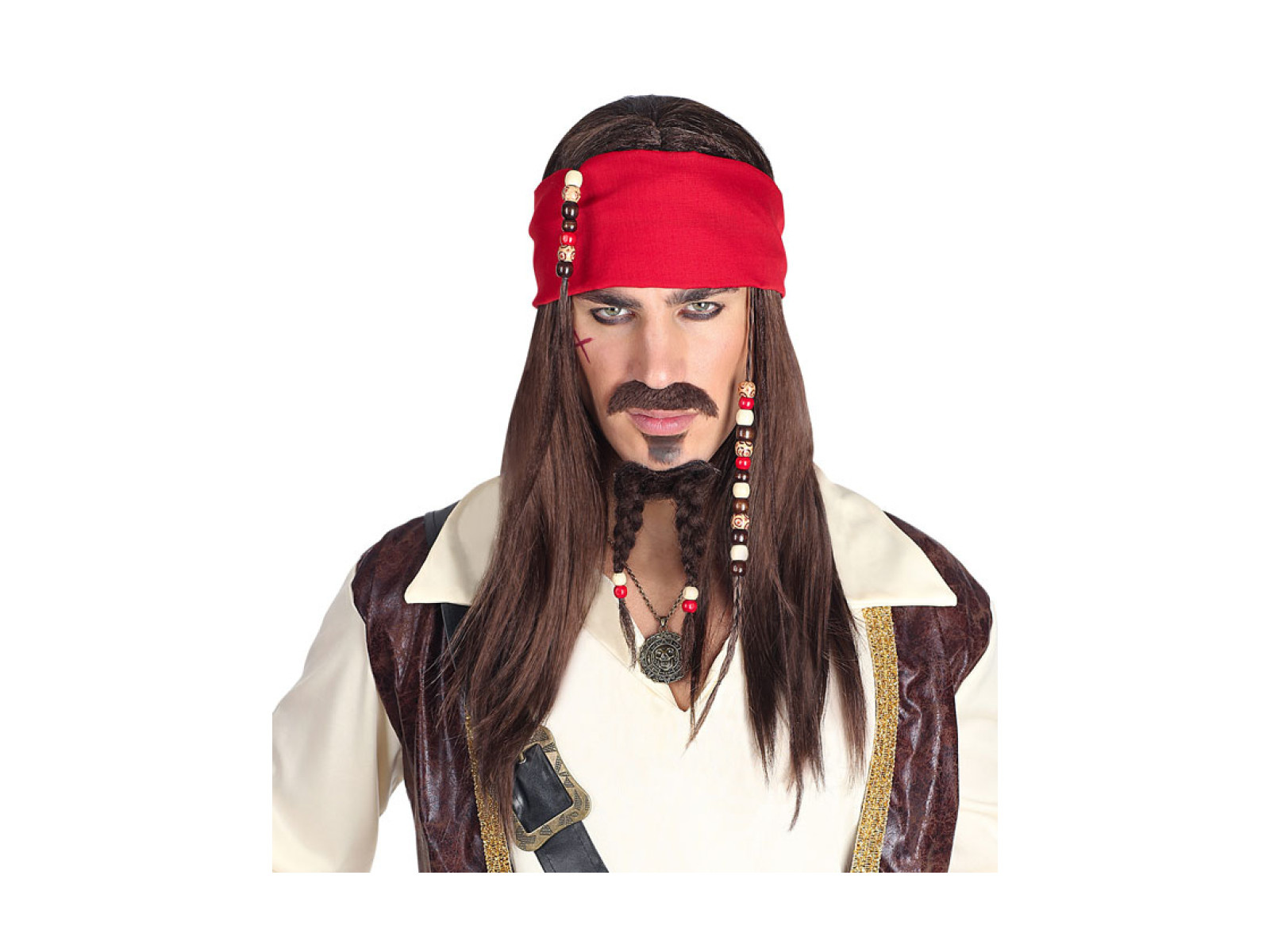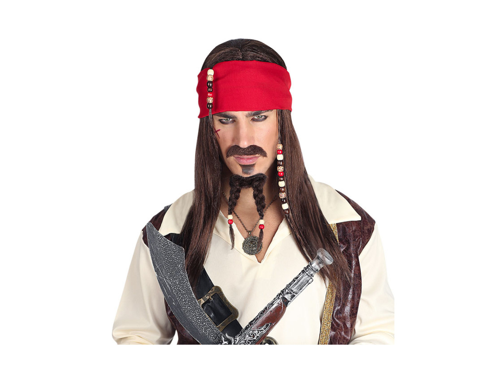 Peruca Piratul din Caraibe cu bandană, mustață și cioc cu mărgele